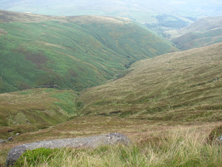 Keeping west the path finally meets the Pennine Way and then turns South East towards Kinder Downfall. More brilliant views down to Hayfield and Kinder Resevoir. Stopped at Kinder Downfall for some fruit. What is it about the sheep around there - they are not like normal sheep - cheeky buggers come up close and try to nick your food. - one was trying to nuzzle it way into my rucksack !!.
